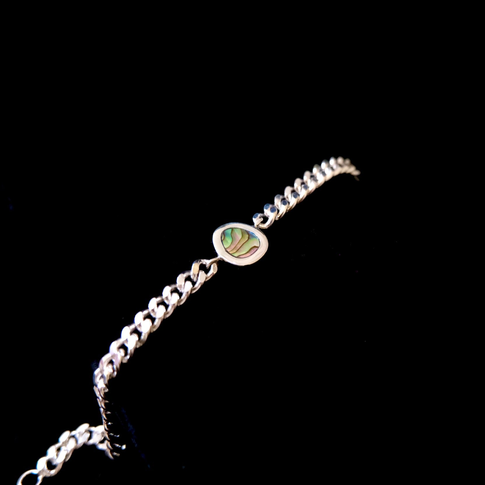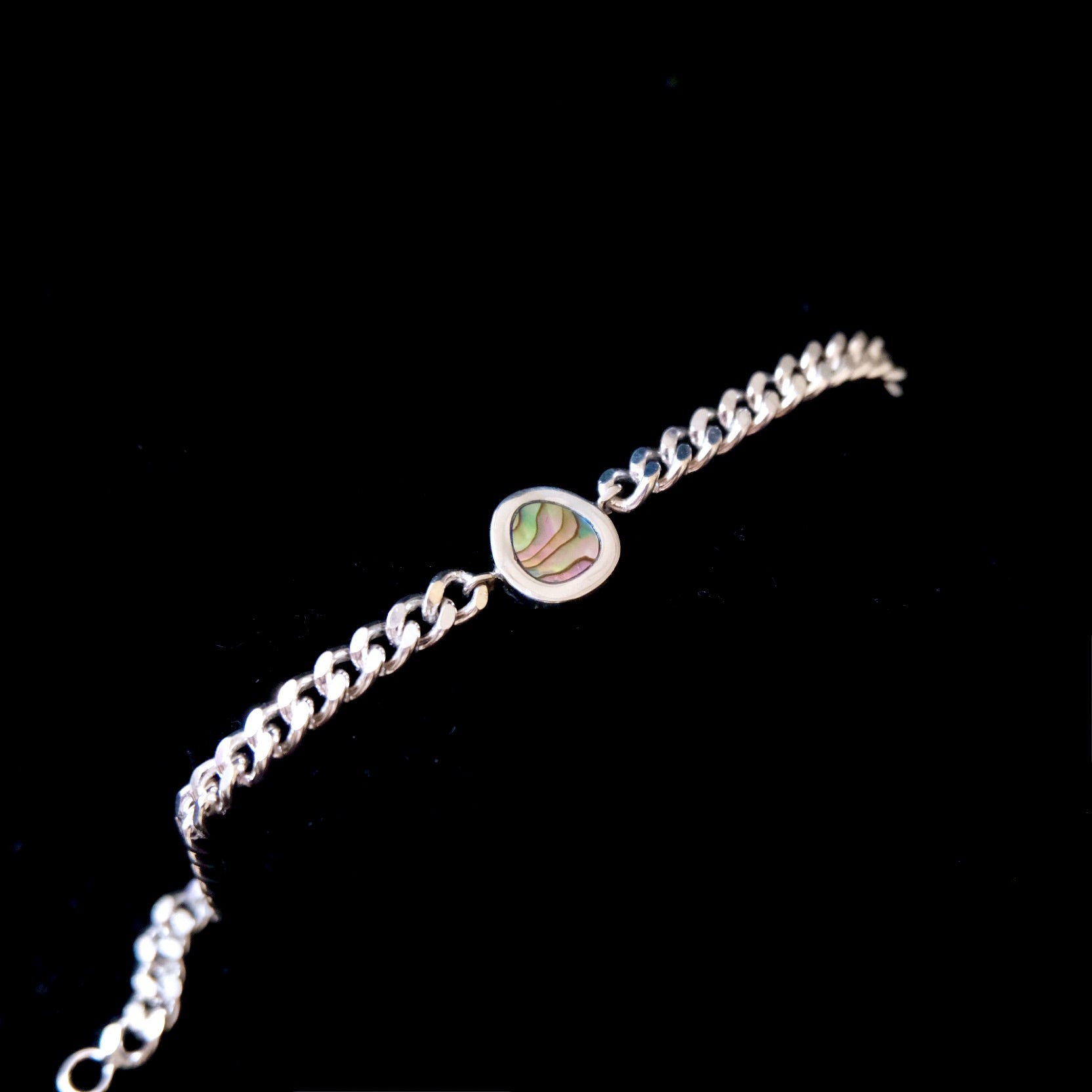 • Sterling silver curb chain bracelet, 5mm wide, with a center abalone inlay set in sterling.