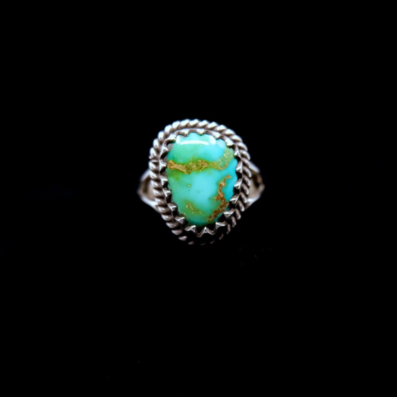 - Rich greenish blue Stone Mountain turquoise with gold matrix set in sterling silver with a serrated bezel and rope border.